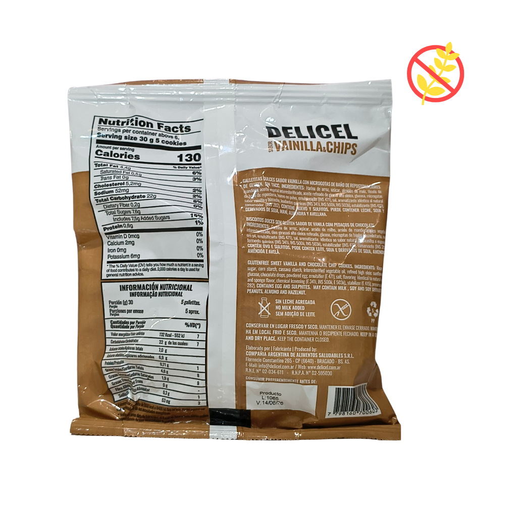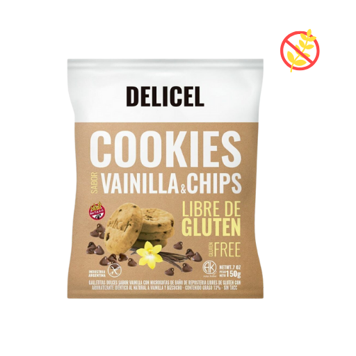 Disfruta de unas deliciosas Galletitas de vainilla y chips Delicel. Estas galletitas son perfectas para aquellos que buscan un snack dulce y sabroso, pero sin gluten.