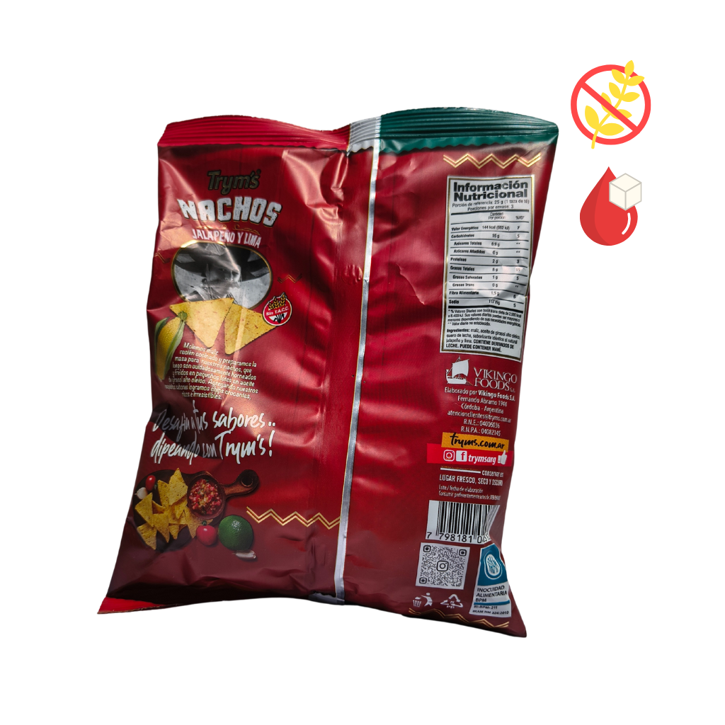 Disfruta de una explosión de sabor con los Nachos jalapeño y lima Tryms. Estos deliciosos snacks horneados son perfectos para aquellos que buscan una opción libre de gluten. La combinación de sabrosos ingredientes le da un toque picante y refrescante que te hará querer más.
